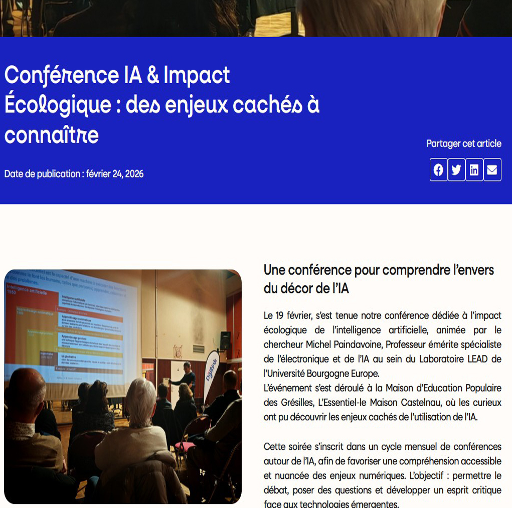 Dans le cadre de l’action Dijilink, le 19 février 2026, s’est tenue une conférence dédiée à l’impact écologique de l’intelligence artificielle, animée par Michel Paindavoine, Professeur émérite spécialiste de l’électronique et de l’IA au sein du LEAD. Suite… LIEN Dijilink