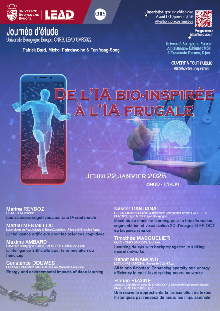 Cette journée d’étude se propose de s’intéresser de façon plus précise au coût énergétique de l’IA, d’étudier plus en profondeur les liens entre IA bio-inspirée et IA frugale, de présenter un paradigme incontournable en termes d’IA bio-inspirée, à savoir les réseaux de neurones impulsionnels, mais aussi de présenter quelques applications de l’IA au bénéfice de la société.